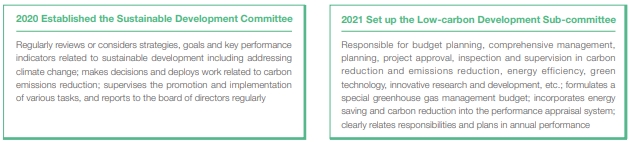 Sinochem International attaches great importance to the management of climate change and carbon emissions reduction. It has established a sustainable development committee under the board of directors to incorporate low-carbon development into its sustainability strategy, and clarifies the strategic position of the "dual carbon" goal from the perspective of top-level design. The Sustainable Development Committee has a low-carbon development sub-committee under the company's management level, which is responsible for refining and consolidating the company's work in low-carbon development and other fields.